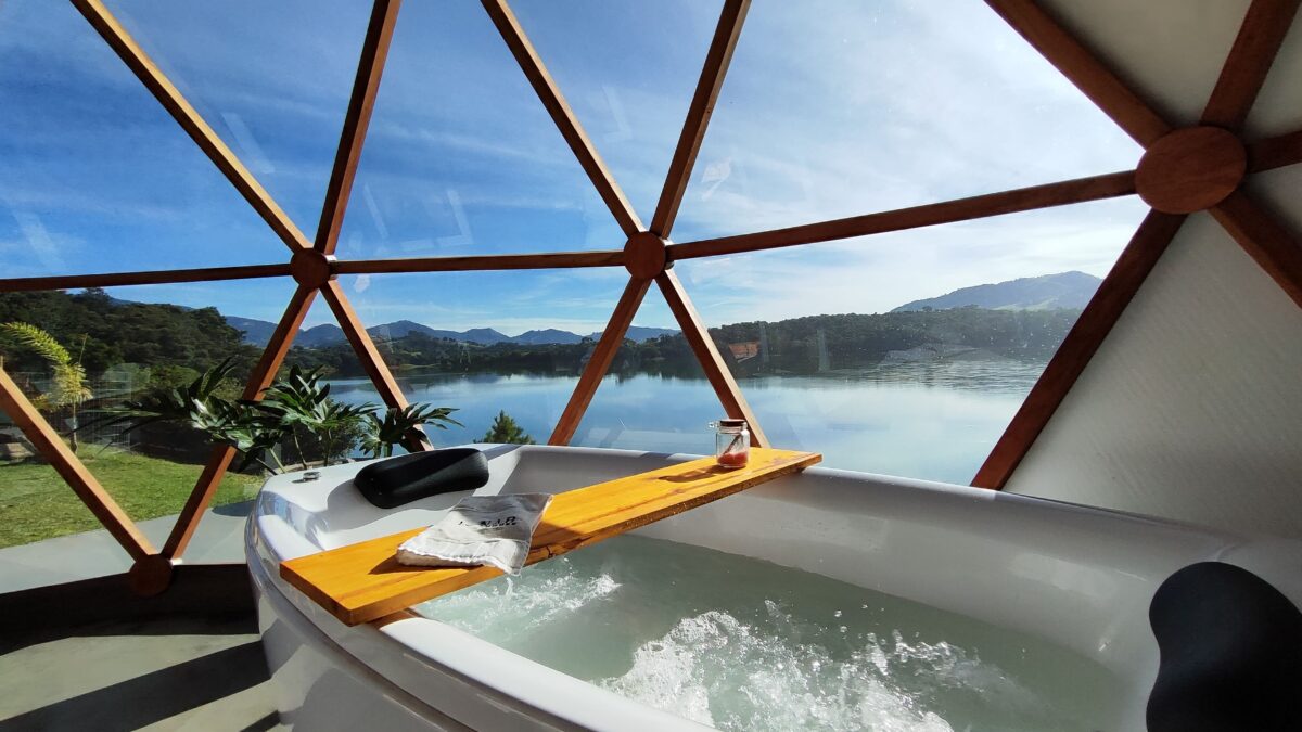Temos um Domo geodésico com cama queen, uma hidromassagem, um banheiro, um cantinho do café e uma mesa para home office.